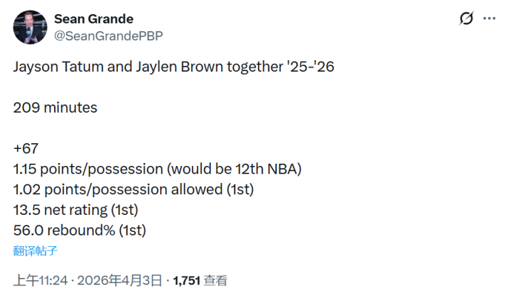 此外,绿军记者Sean Grande的数据显示,本赛季塔图姆与杰伦-布朗同场的209分钟里,球队净胜分达+67,进攻效率每回合1.15分可跻身联盟第12,防守效率每回合仅失1.02分、净效率值+13.5、篮板率56.0%均位列联盟第一。