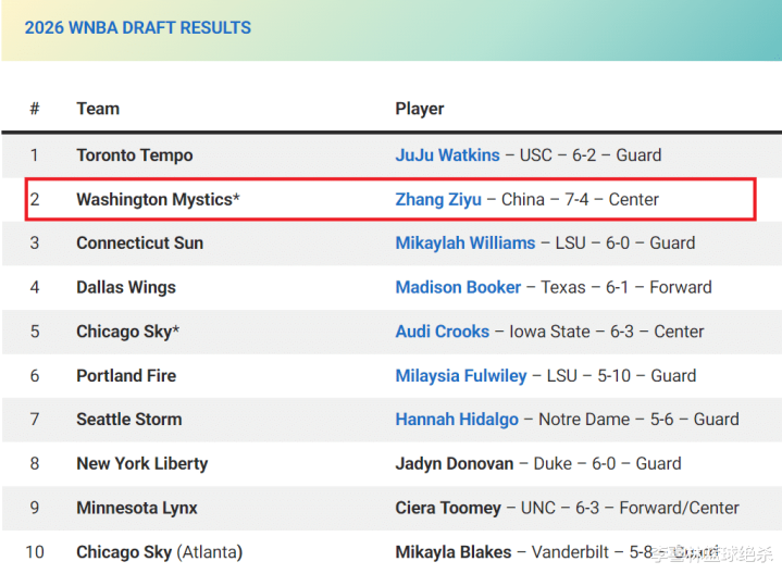 目前还未满19岁的张子宇将在明年符合参加WNBA选秀的资格。著名选秀网站NBA Draft Room在最新的2027WNBA选秀预测榜上将张子宇排在了第二位。排在第一位的是来自南加州大学的后卫朱朱·沃特金斯。